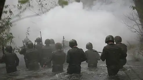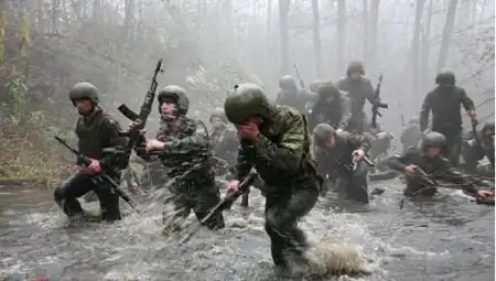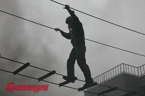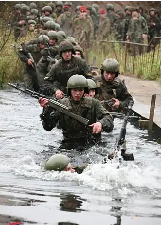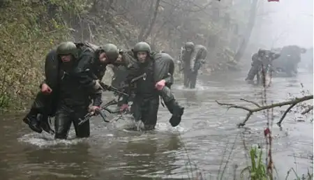 И началось… Главное выдержать 15- километровый марш-бросок по пересеченной местности, не выдохнуться. И как на зло дорога непростая, постоянно приходилось пробираться сквозь лес, преодолевать водные преграды. Бойцы с полной выкладкой отражали нападения предлагаемого противника. В промокшем насквозь комбинезоне, выскакиваешь на берег и сопровождаемый взрывами, бежишь. Колючая проволока, барьеры, деревянные стены, бетонные щиты, кругом огонь, едкий дым, автоматные выстрелы... Постоянно спотыкаешься, задыхаешься от дыма, падаешь, карабкаешься в противогазе с запотевшими стеклами на высокую бревенчатую баррикаду. Думаешь, про себя: «Дальше! Не сдаваться!» А впереди озеро. Размеры не впечатляют, зато вода в нем – по грудь. Бегом!!! Главное – не намочить автомат и уложиться во время, которое не должно превышать один час тридцать минут.