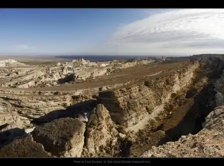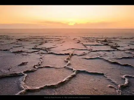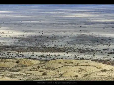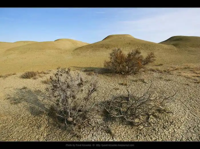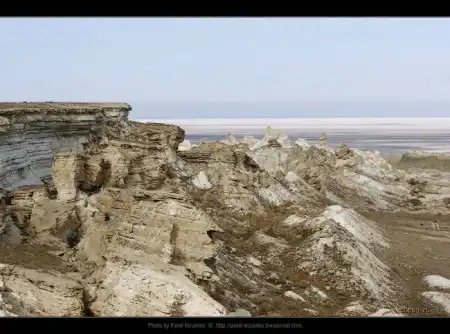 Озеро Судочье (Судовшин) - самый большой внутридельтовый водоём Амударьи. До тех пор, пока река полноводила, два её рукава Раушан и Приемузяк питали Судочье, которое через протоку соединялось с Аральским морем. Сегодня большая вода отсюда ушла примерно на 150 км, а озеро обмелело и распалось на несколько более мелких. На заднем плане возвышается Устюртское плато. Прибрежная зона покрыта мелким кустарником, солью, а почва поражает разнообразием фактуры и цвета.