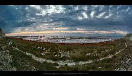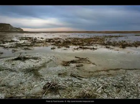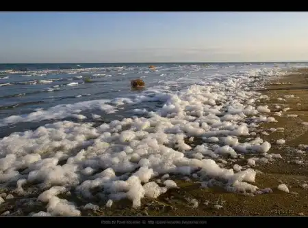 Сама кромка воды пенится, как при ручной стирке, а вдоль берега летают белые хлопья. Море здесь очень мелкое, это видно по набегающим волнам. Я прошел вглубь метров 30, но вода как была по щиколотку, так и осталась. Дно неприятное, глиняно-илистое и чмокает как в болоте. Вообще холодно было, около 0 и ветер, но, сами понимаете - не искупаться я не мог :) Здоровье, слава Богу, не пострадало.