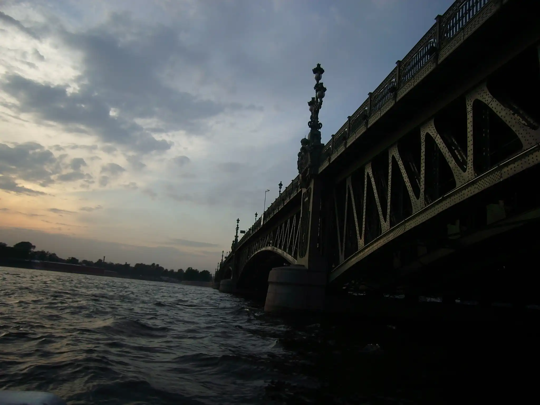 А это вечерняя прогулка на речном трамвайчике. Вид на дворцовый мост. Тогда вечером впечатления были острее чем днем. Кто видел ночную Неву, тот меня поймет. Безобидная река превратилась в пугающую черную бездну.