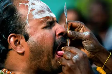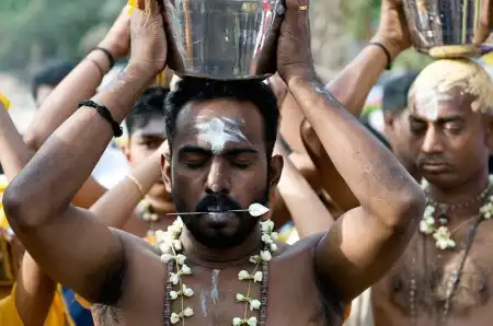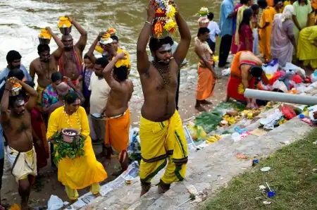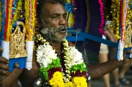 Сингапурский фестиваль, который рядовому европейцу кажется чудовищным и кадры с которого даже вошли в фильм «Шокирующая Азия». Главное его действо – процессия людей и «тележек»-kavadis. К «кавадис» прикреплены колья и крюки, индусы пронзают ими свою кожу и щеки и тянут за эти круки тележку целых четыре километра. Самые выносливые даже складывают на тележки грузики. Процессия начинает в храме Sri Srinivasa Perumal на Serangoon Rd и идет до храма Sri Thandayuthapani. Так, оказывается, воспитывается вера во Всевышнего.
