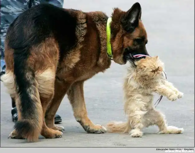 1 мая. Служебная собака показывает свои навыки, аккуратно поднимая кота точно в соответствии с данным приказом, на базе ОМОНа под Москвой.