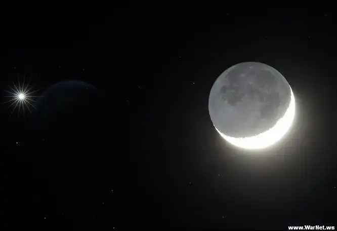 20 мая. Полумесяц и планета Венера подошли близко друг к другу на вечернем небе. Верхняя часть луны освещена отраженным от Земли светом. "Шипы" вокруг Венеры вызваны искажениями, которые дают линзы объектива.