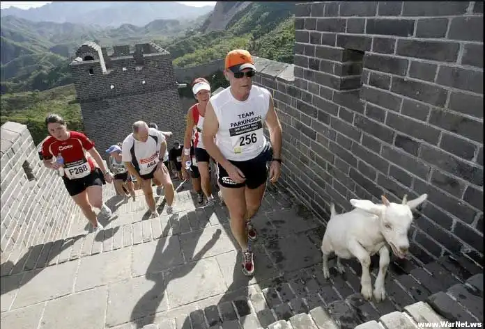 Какой-то козел возглавляет колонну бегунов на восьмом Марафоне по Великой стене в Китае. Немногие другие марафоны могут сравниться с изнурительным походом по 3 800 ступяням вверх и вниз по самому известному символу Китая.
