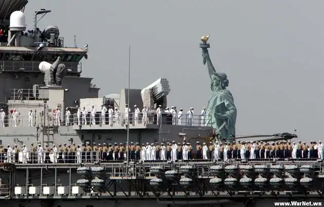На днях. Моряки и морские пехотинцы на построении на корабле военно-морских сил США на рейде Нью-Йорка.