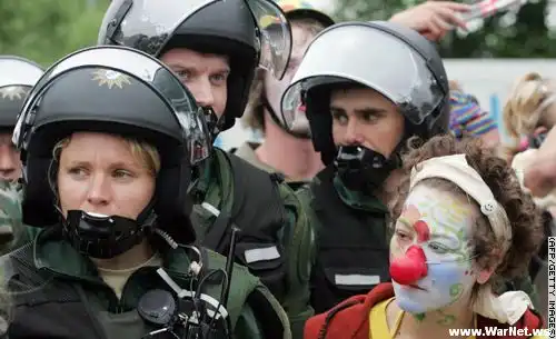 Полицейский и протестующий в Montebello, Канаде. Полиция применяла слезоточивый газ, чтобы сдержать протестующих вне Замка Montebello в провинции Квебек, где проходил саммит североамериканских стран