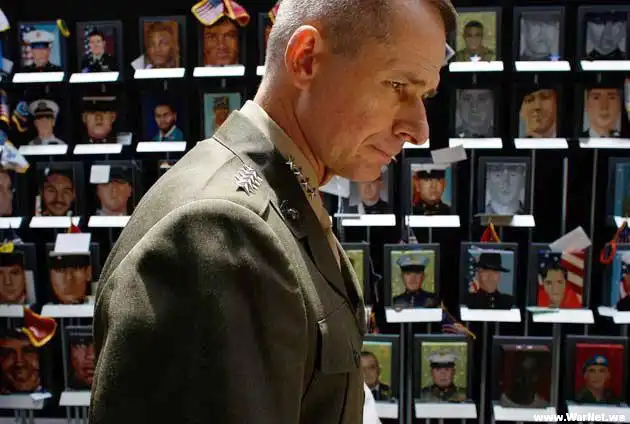 Председатель американского Объединенного комитета начальников штабов, генерал Peter Pace идет вдоль выставки лиц павших солдат в Национальном кладбище.