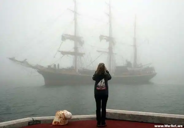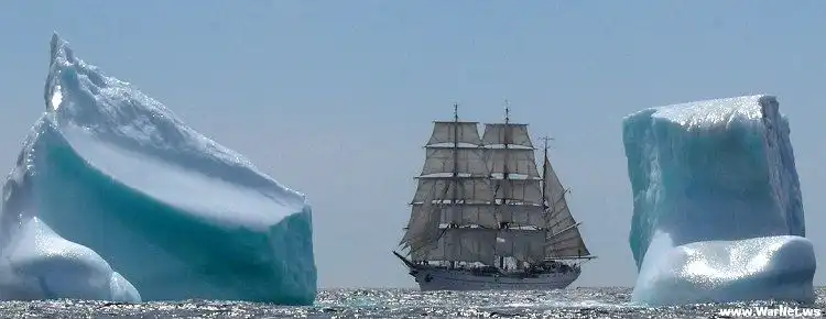 Залив святого Лоуренса: Немецкий парусник "Gorch Fock " лавирует между айсбергами около канадских берегов.