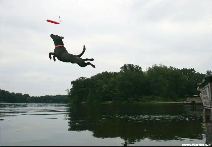 Лабрадор Кони мужественно прыгает за динамитной шашкой, брошенной шахидами-браконьерами, в окрестностях Ново-Огарево, Россия