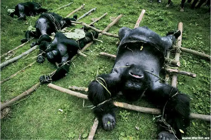 Убитые гориллы в Конго. На переднем плане отец семейства, чуть вдали его беременная подруга