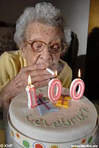 Столетняя англичанка Winnie Langley прикуривает свою 170-ти тысячную сигарету от свечей на своём юбилейном торте. Она начала курить в семь лет, в начале Первой мировой войны.