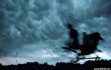 Силуэт рикши на фоне облаков муссона в Ишнпуре, Индия