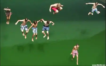 Подростки прыгают с моста в холодную воду речного канала Isar в Мюнхене, Германия