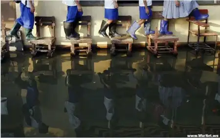 Дети выходят из класса в филиппинской школе, пострадавшей после наводнения, но занятия там всё равно продолжаются
