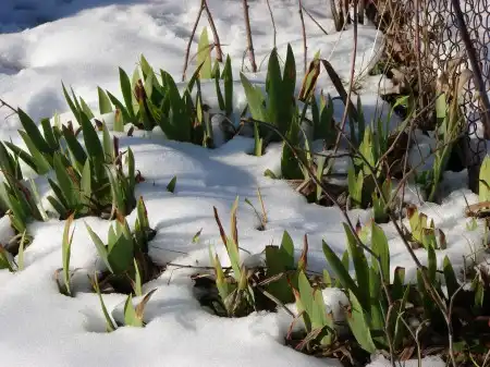 ближе к вечеру, температура +13, снега осталось немного, а вот тюльпаны расцветут примерно через месяц