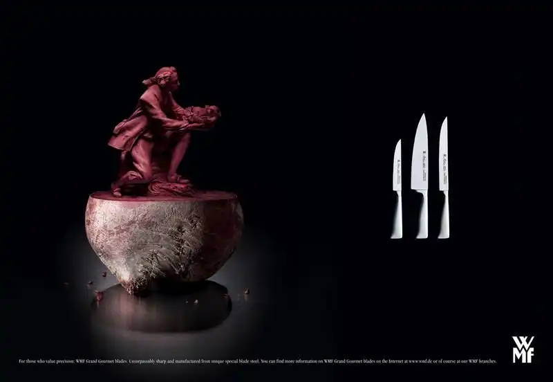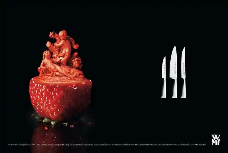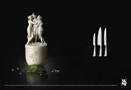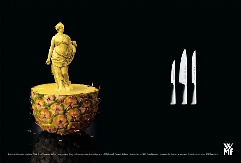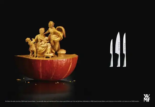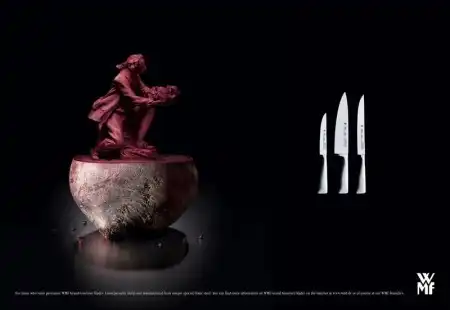 Рекламная акция изготовителя самых острых кухонных ножей - WMF, утверждает что с помощью этих инструментов можно производить всякого рода креатив с дарами природы. Да такими ножами и колбаску порезать можно, да и так мало кто в гости не прошеный постучится... ;)