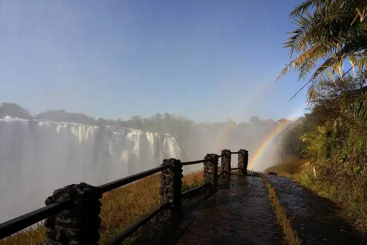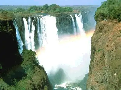 Водопад Виктория - На реке Замбези, на границе Замбии и Зимбабве, находится четвертый в мире по ширине потока и один из крупнейших по расходу воды и мощности водопад - Виктория. Его высота-110 м, ширина-1700м, расход воды-от 1,4 тыс. до 14 тыс. куб. м/c. Река Замбези превращается в пенный и ревущий, срывающийся с отвесных скал каскад воды одного из великолепнейших водопадов. Величавая Замбези, вобрав в себя воды с площади огромного бассейна в 1,3 млн. кв. км, подходит к базальтовой щели и сваливается в бездну с потрясающим гулом.