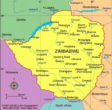 Географическое положение: Государство на юге Африки. На севере граничит с Замбией и Мозамбиком, на востоке - с Мозамбиком, на юге - с ЮАР, на юго-западе и западе - с Ботсваной. Почти всю территорию страны занимают плато Матабеле и Машона высотой 800-1500 м., наибольшая высота 2596 м. (гора Иньянгани). На севере плато ступенчато понижается к долине реки Замбези, на юге - к реке Лимпопо. Общая площадь 390,7 тыс. кв. км.