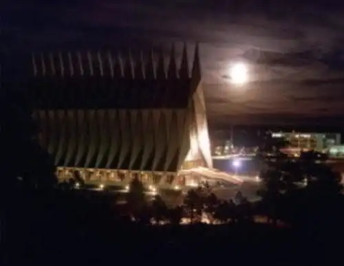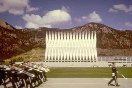 По задумке архитекторов из компании skidmore, owings & merrill часовня должна была напоминать 17 60-метровых космических кораблей, устремленных в небеса и готовых вылететь на встречу богу в любую минуту. Строительство было завершено в 1963, на него было потрачено $3 миллиона долларов. Особенно политикам не понравился тот факт, что вместо 1 шпиля было спроектировано 19, к чему такие траты? В итоге сошлись на 17. Не менее экстравагантно и ее окружение - реактивные самолеты, вертолет и солдаты, забегающие помолиться перед вылетом.