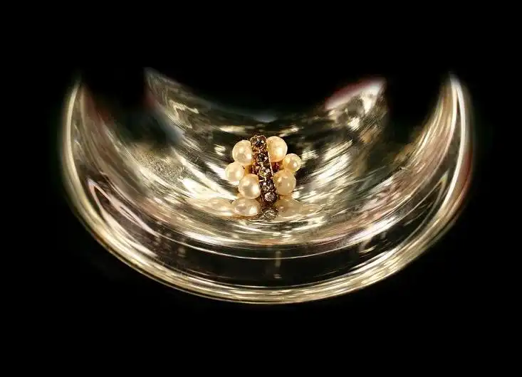 1. Сделать в листе абсолютно непрозрачного материала отверстие чуть меньшего диаметра, чем исследуемая жемчужина. Приложив жемчужину к отверстию, поднести лист к сильному источнику света (лампа 100 Вт) таким образом, чтобы жемчужина оказалась между этим источником и наблюдателем. Можно различить сравнительно тонкий светящийся слой (до 2 мм) перламутра и темное ядро затравки культивированной жемчужины