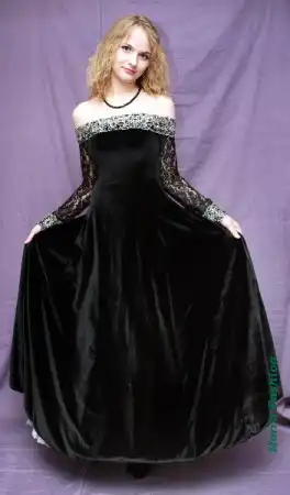 Пышное платье из черного бархата с открытыми плечами.