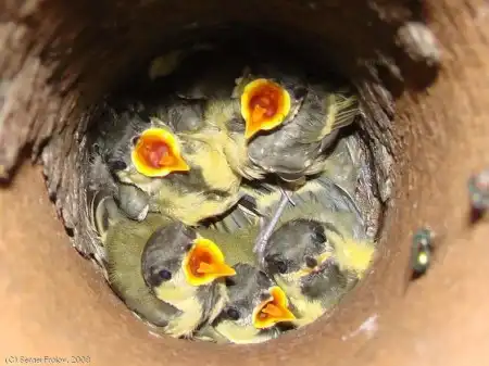 Тем временем стал наблюдать, как их кормят родители. Бедные птицы: им приходится целый день летать и ловить насекомых чтобы прокормить такую прорву!
