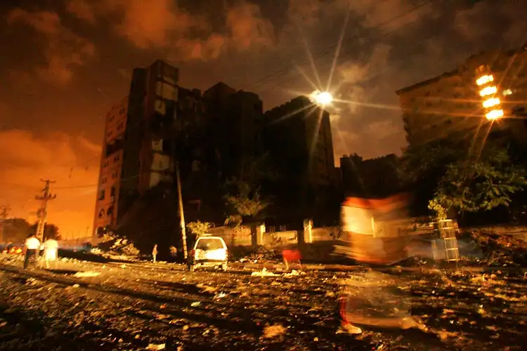Дым над одним зданий в предместье Бейрута, где сидит Хизбалла
