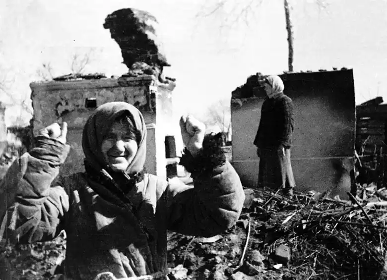 66-летняя колхозница А.Зимина из села Гавриловка, проклинает немцев, которые расстреляли её дочь и внуков