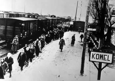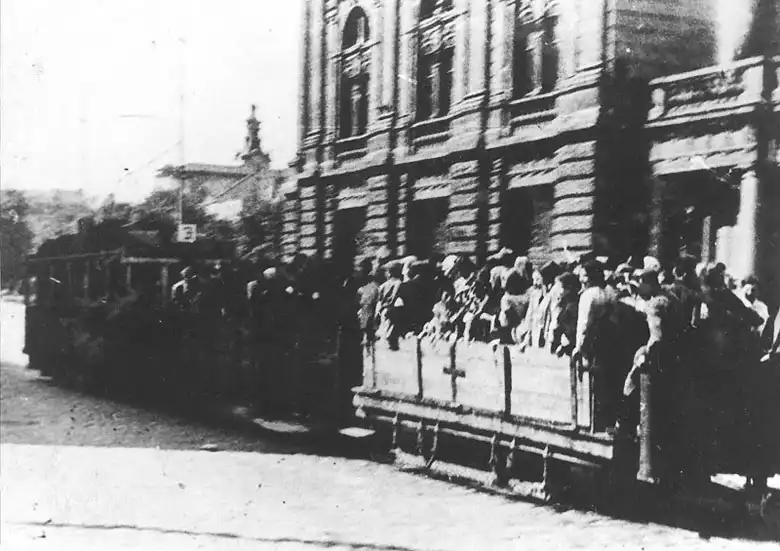 Советские граждане под охраной немецких солдат на станции Ковель перед отправкой в Германию