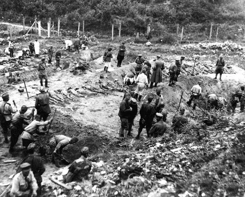 Эксгумация трупов в присутствии представителя Чрезвычайной Государственной комиссии академика Н.Н.Бурденко во дворе лагеря военнопленных