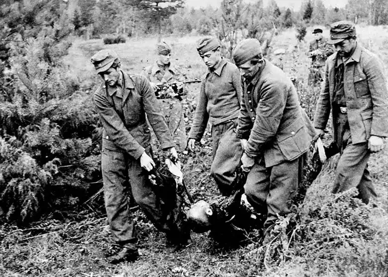 Немецкие военнопленные переносят тела – узников концлагеря «Клоога» (Эстония), расстрелянных перед приходом Красной армии и не успевших полностью сгореть