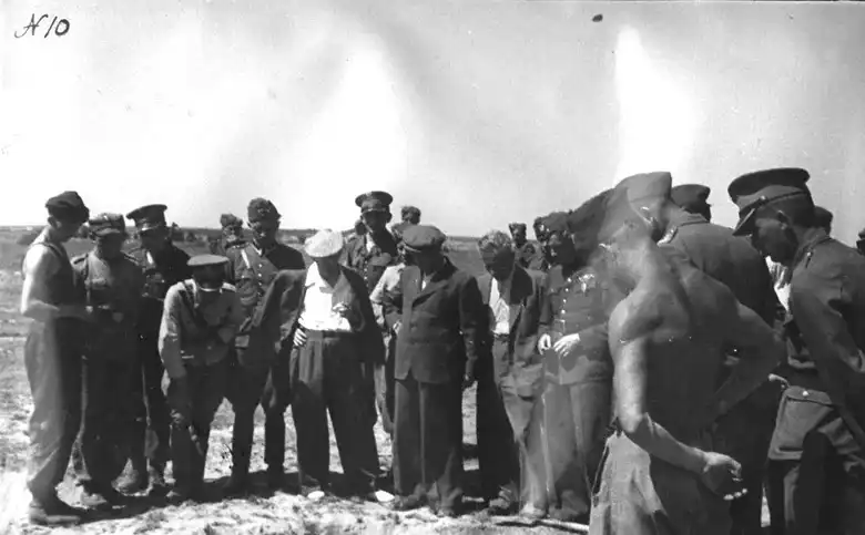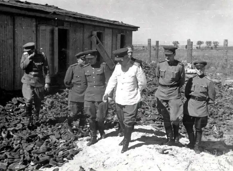Члены совместной советско-польской комиссии осматривают подсобное хозяйство концлагеря «Майданек», где для удобрения использовалась зола крематория