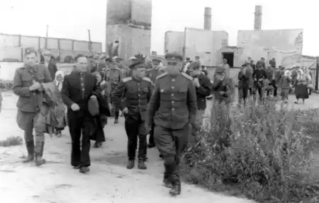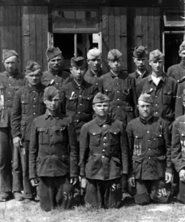 Советские военнопленные в поношенных германских мундирах и знаком «SU»