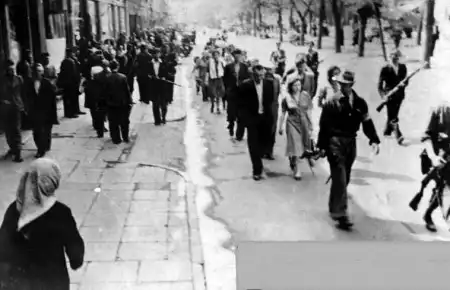 Представители совместной советско-польской комиссии показывают иностранным корреспондентам и местному населению концлагерь «Майданек» и следы преступлений. На заднем плане – крематорий