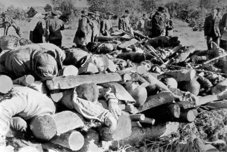 Тела евреев – узников концлагеря «Клоога» (Эстония), расстрелянных перед приходом Красной армии. Трупы сложены в специальные пирамиды для сожжения