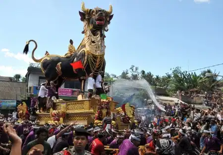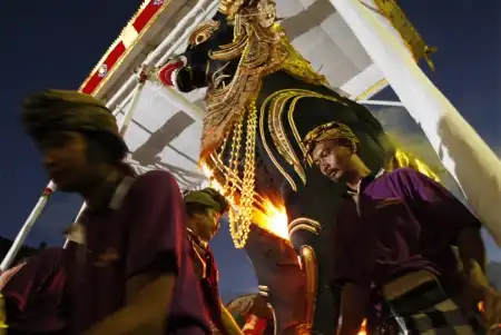 Недавно, на острове Бали, глава королевской семьи Ubud под именем Agung Suyasa был отправлен на покой в редких традициях с помощью королевского погребения - крупнейшего за последние десятилетия. Тело умершего было соженно в гигантском быке-саркофаге.