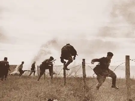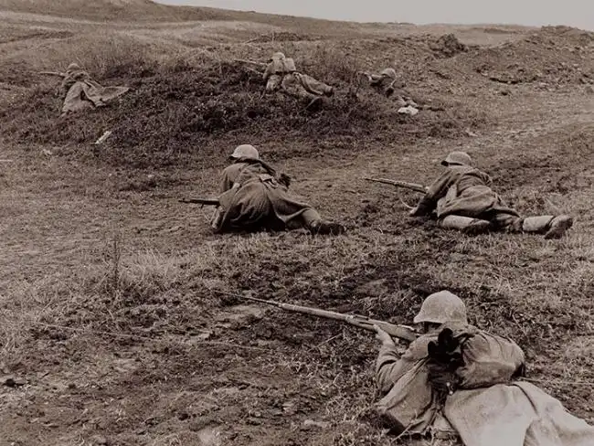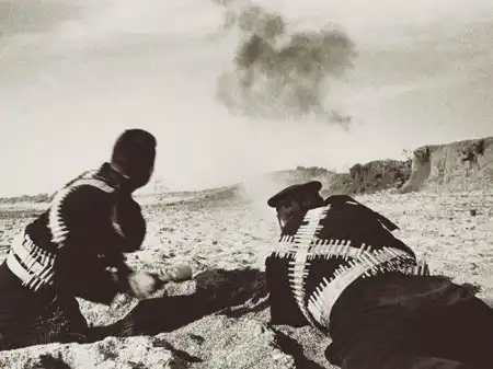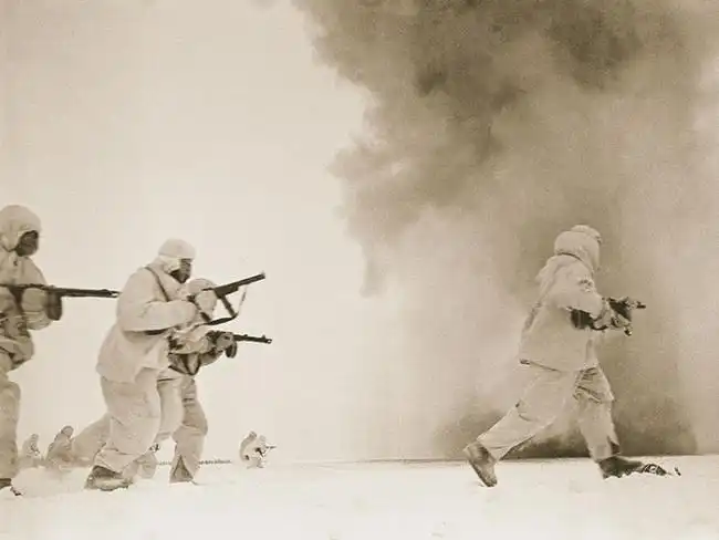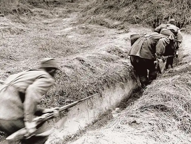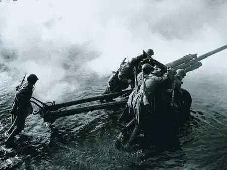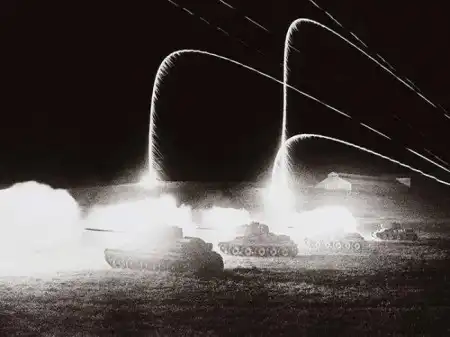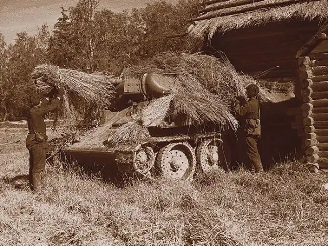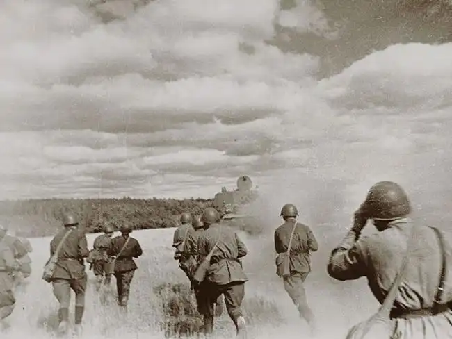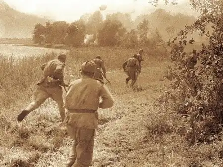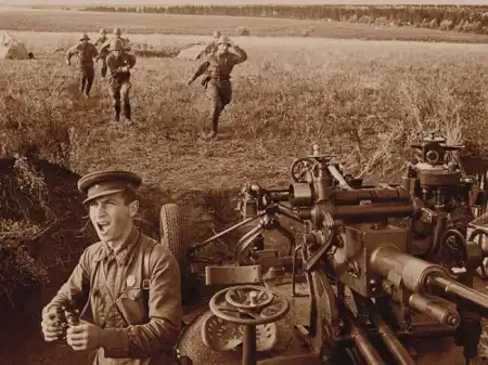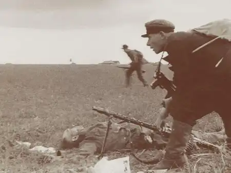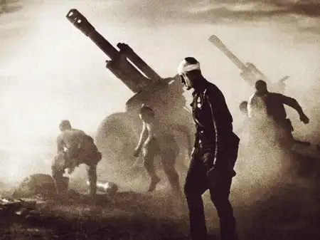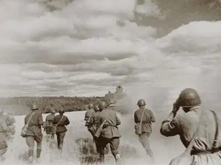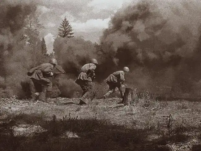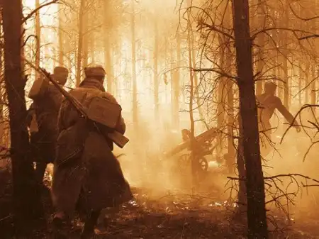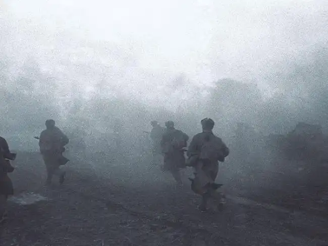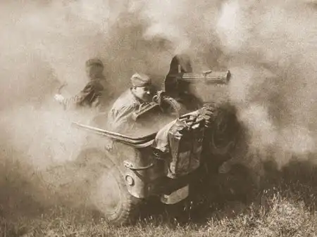 Расчет ПТР сержанта Павла Тарасова под прикрытием дымовой завесы сближается с вражескими танками.