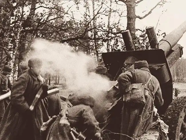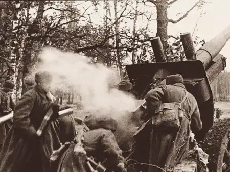 Лучший орудийный расчет подразделения капитана Хлебникова ведет огонь с закрытой позиции. Справа — командир орудия младший сержант комсомолец Д. Калякин.