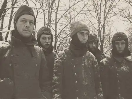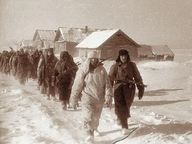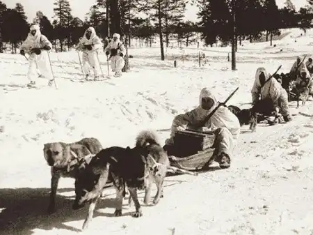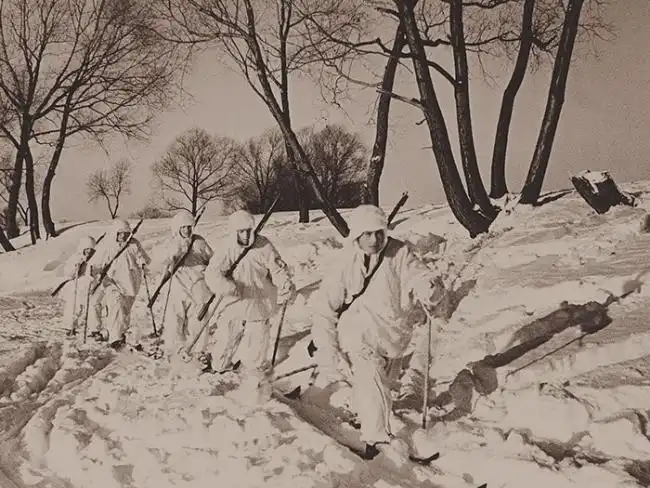 Бойцы-лыжники подразделения лейтенанта Малкова на марше.