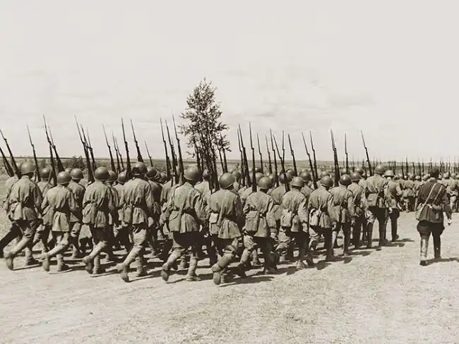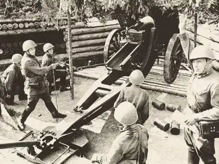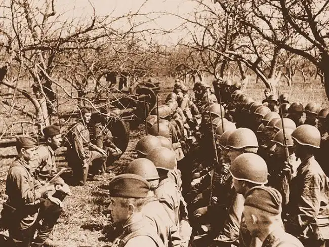 Артиллеристы, получившие новое боевое оружие, дают торжественную клятву.