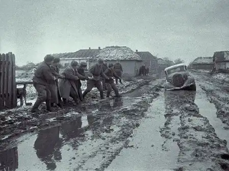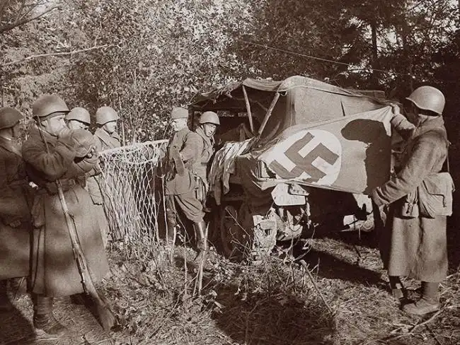 Захваченная штабная машина. В ней находились знамя, дамское белье, гамак, часы настольные, штабные документы.