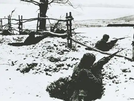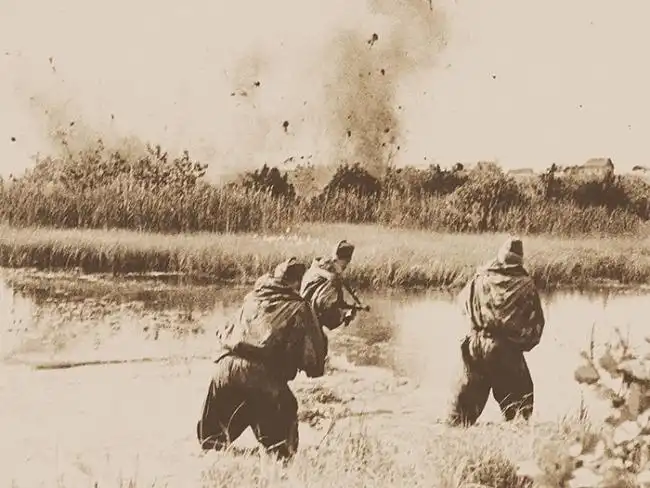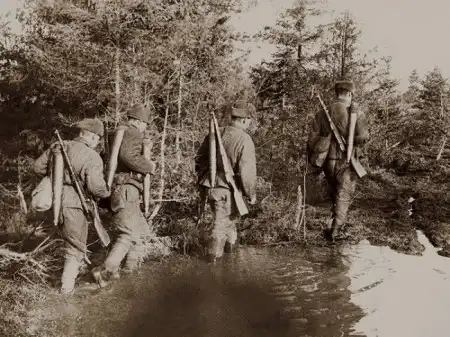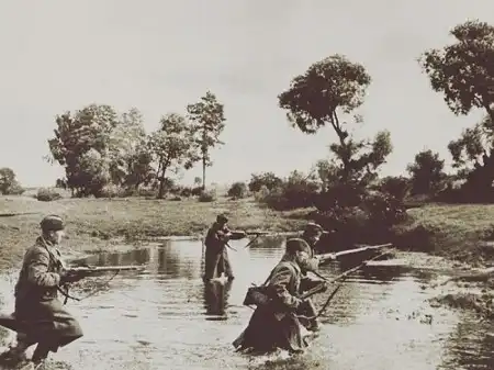 На подступах к Восточной Пруссии автоматчики очищают берег озера от немцев.