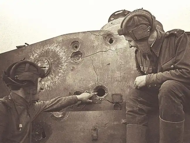 Курская Дуга. Как били «Тигров». Насквозь и даже глубже! Командир танка, отважный лейтенант Б. В. Смелов, подбил танк «Тигр». Тов. Смелов показывает лейтенанту Лихнякевичу (подбившему в последнем бою 2 фашистских танка) пробоину в башне «Тигра». Ее сделал обычный бронебойный снаряд из 76-миллиметрового танкового орудия. Башня «Тигра» вся в трещинах от нескольких попаданий наших снарядов.
