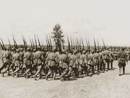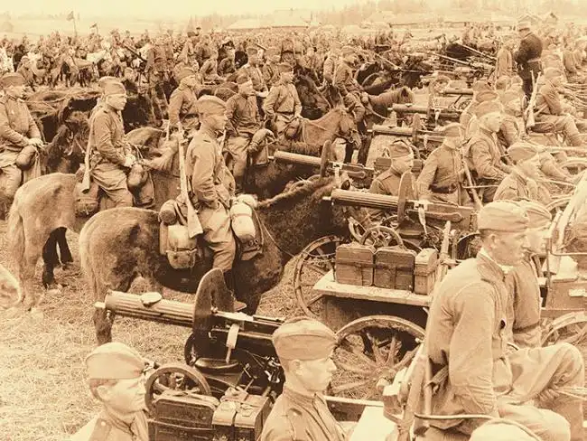 Тачанки на параде конногвардейцев гвардии генерал-лейтенанта Н. С. Куликовского.