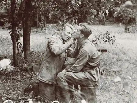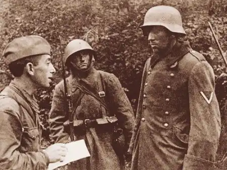 Младший лейтенант С. Г. Маловский допрашивает пойманного фашистского разведчика Ванкера Гельмута.