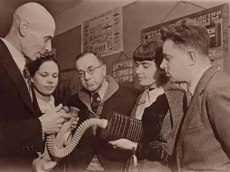 Актер И. В. Ильинский на занятиях оборонного кружка в Малом театре. Москва.