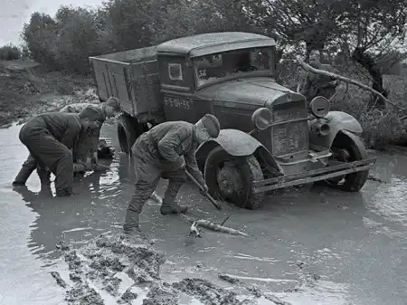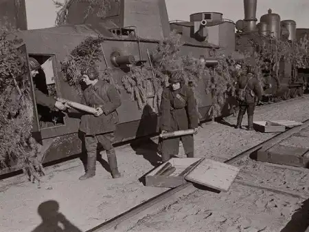 Экипаж бронемашины лейтенанта В. Н. Кохманского за ремонтом железнодорожного полотна.