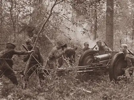 Орудийный расчет лейтенанта Зуева проводит орудие через лесные заросли на новый огневой рубеж.