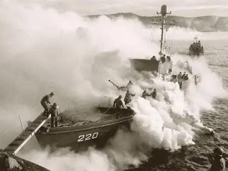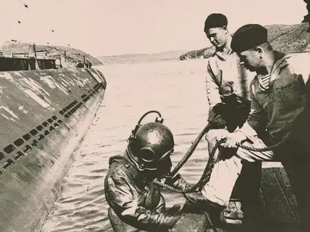 Водолазная группа за проверкой подводной лодки перед выходом на боевую операцию. Северный флот.
