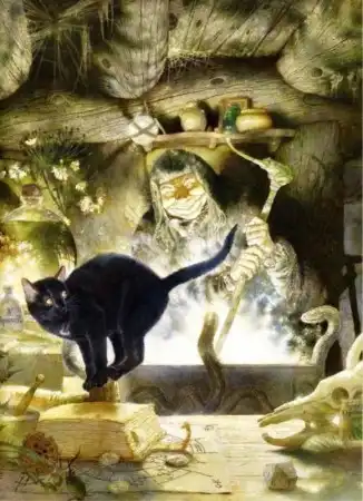 Эта старая колдунья не ходит пешком, а разъезжает по белу свету в железной ступе (то есть самокатной колеснице), и когда прогуливается, то понуждает ступу бежать скорее, ударяя железной же палицей или пестом. А чтобы, для известных ей причин, не видно было следов, заметаются они за нею особенными, к ступе приделанными метлою и помелом. Служат ей лягушки, черные коты, в их числе Кот Баюн, вороны и змеи: все существа, в которых уживается и угроза, и мудрость.